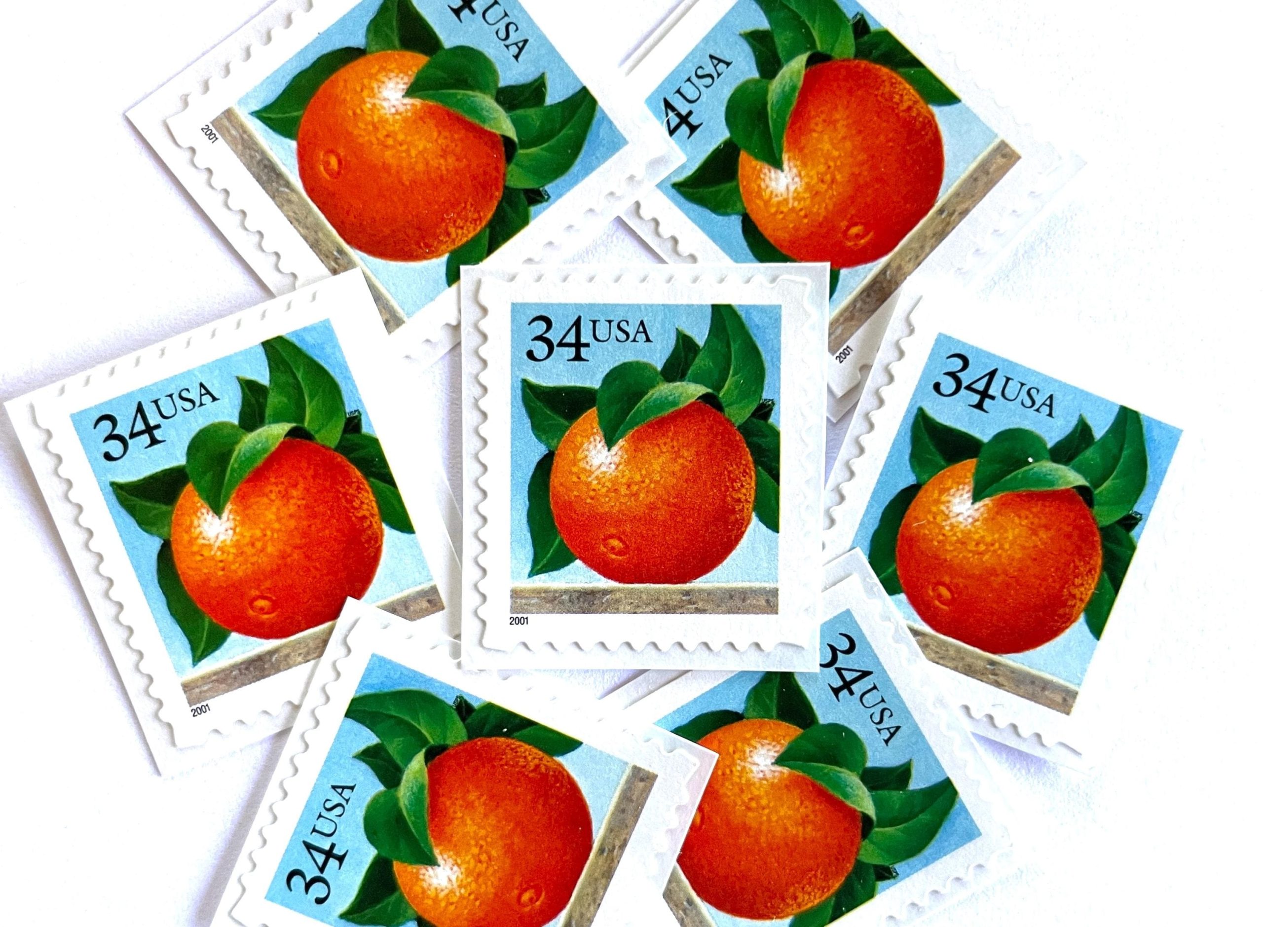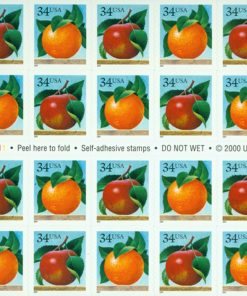 Ned Seidler designed the self-adhesive Apple and Orange stamps at the same time as he did the 1995 32¢ Peach and Pear stamps. The Apple and Orange se-tenant pair was released in 2001, first as a pane of 20 stamps, in convertible booklet form, and later in the year in vending booklets.