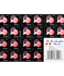 Issued Jan. 28, 2014 this stamp was featured at the Smithsonian’s National Museum of American History to commemorate the 200th anniversary of the “Star-Spangled Banner.” This stamp design features a photograph of the flag that flies over Fort McHenry National Monument and Historic Shrine in Baltimore, MD. This flag is a replica of the one that inspired Francis Scott Key to write “The Star-Spangled Banner” after realizing Fort McHenry had withstood the British attack of Sept.13-14, 1814. The picture of the flag was taken against a backdrop of fireworks during an annual celebration of Defenders’ Day, a legal holiday in the state of Maryland commemorating the successful defense of the city of Baltimore on Sept. 12, 1814 from an invading British force during the War of 1812. Photographer Gary Clark said it was a challenge to get the fireworks and the flag in the same shot and that “the wind picked up quite a bit that night.” Art director Phil Jordan designed the stamp. The Star-Spangled Banner stamp is being issued as a Forever Stamp, which is equal in value to the current First-Class Mail 1-ounce price. This listing is for a double-sided booklet of 20 stamps in new condition.