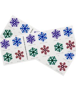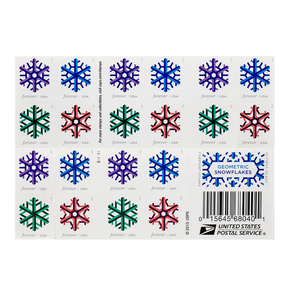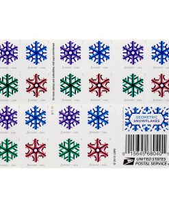 Celebrate the joys of a winter snowfall with Geometric Snowflakes. four colorful new stamps issued in a booklet of 20. Each new stamp depicts a different snowflake drawn in one of four colors: purple. pink. green. or blue. These bright. cheerful stamps are sure to add a whimsical splash to holiday cards. thank-you notes. invitations. greeting cards. and any mailing that calls for a touch of warmth during the coldest months of the year. Art director Antonio Alcal and Leslie Badani designed the stamps.
