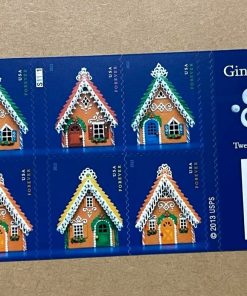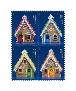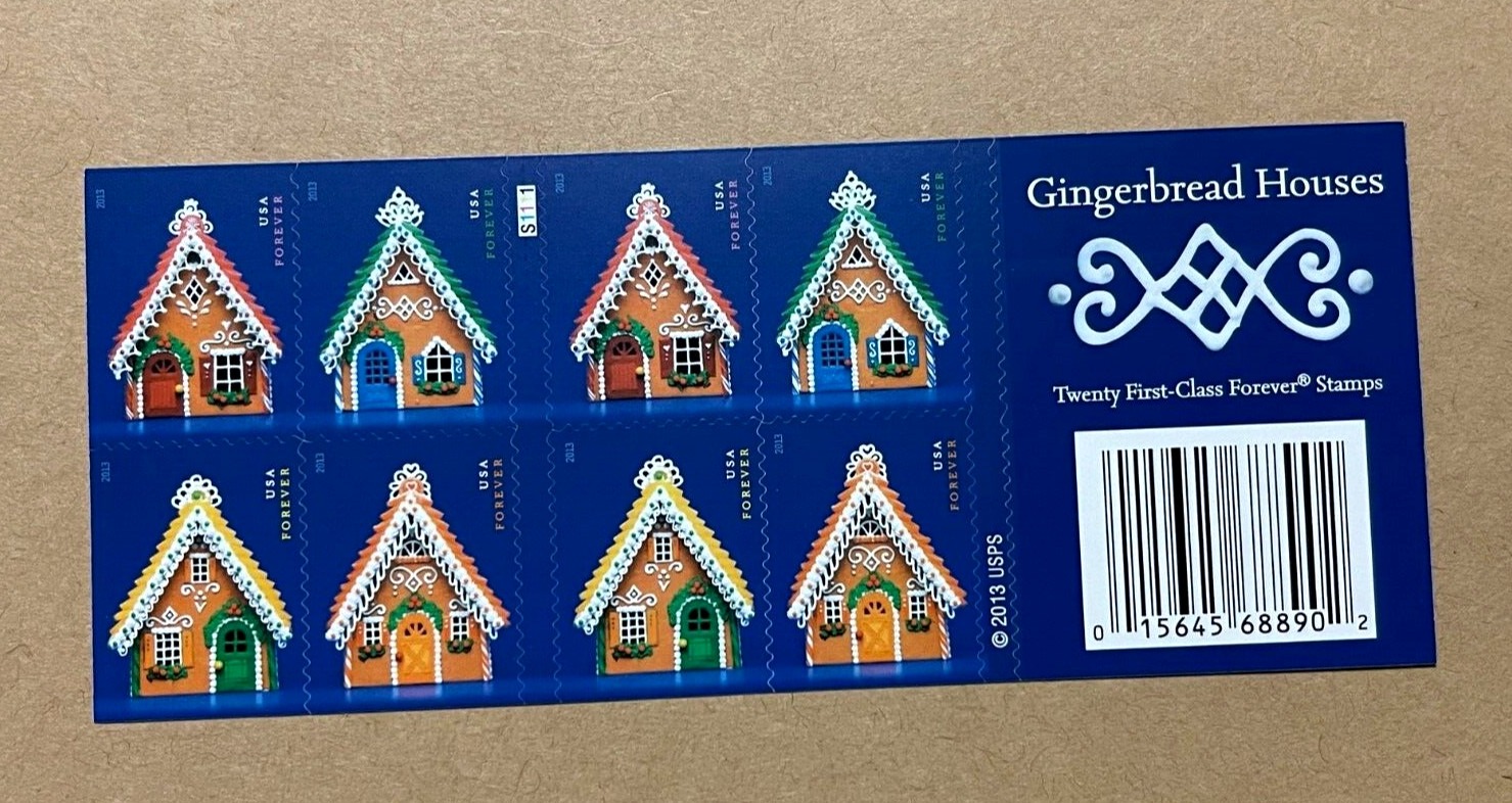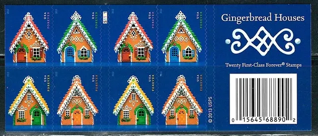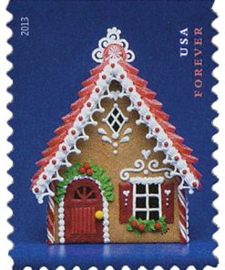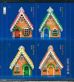 This stamp is part of a block of four issued for the 2013 holiday season. The gingerbread houses were constructed specifically for the stamp design.
