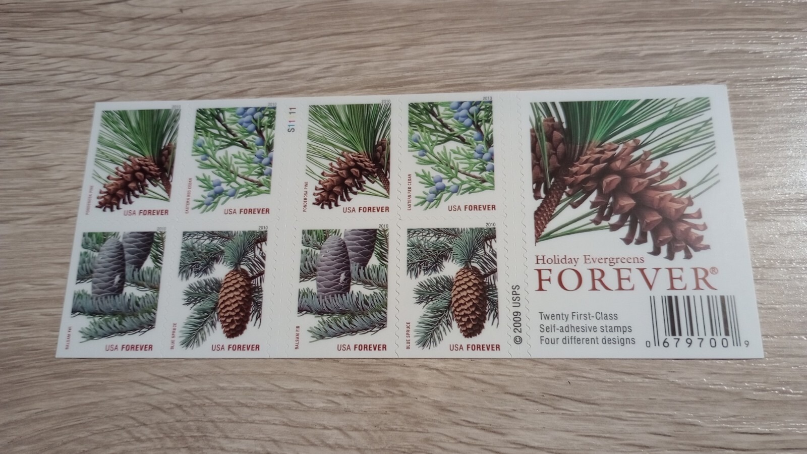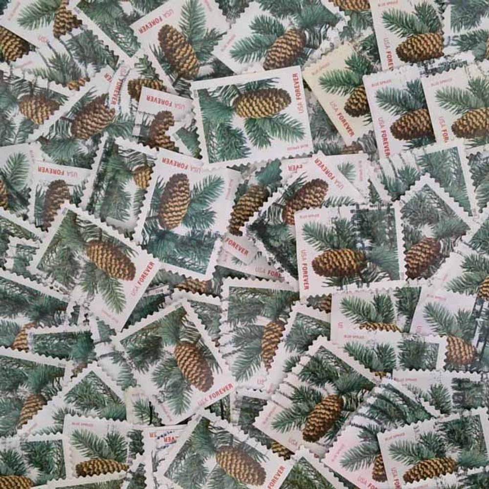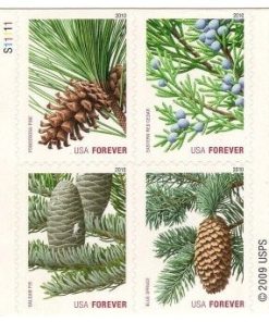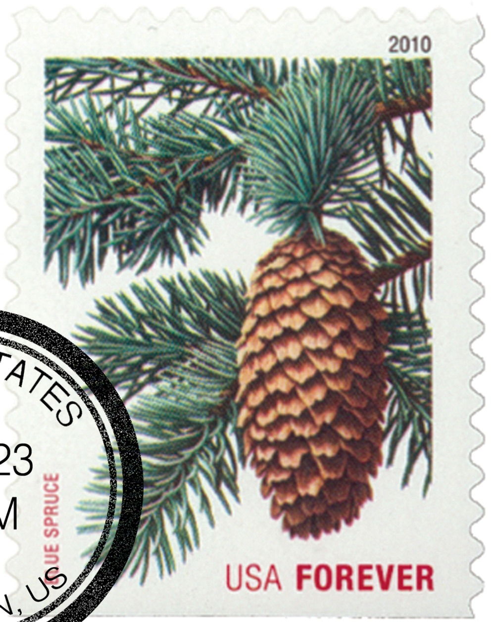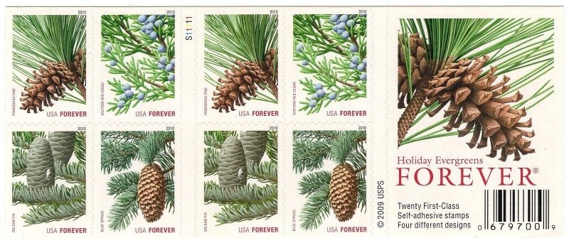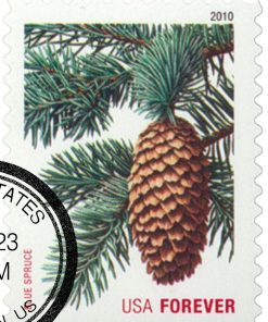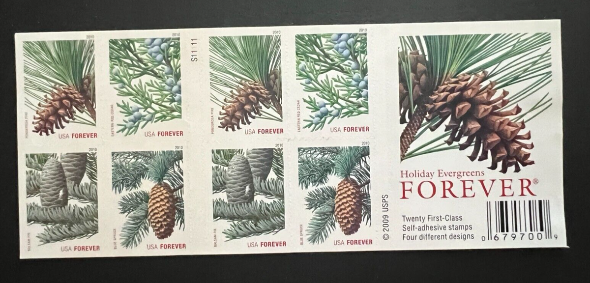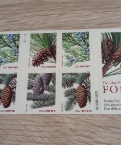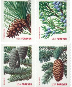 Decorating with evergreens during the winter holiday season is a popular and appealing tradition. In 2010, the U.S. Postal Service joined in the winter celebrations by issuing Holiday Evergreens (Forever), beautiful new stamps that feature closeup views of the foliage and cones of four different conifers: ponderosa pine, eastern red cedar, blue spruce, and balsam fir. The artist, the late Ned Seidler, was a gifted painter of nature subjects. When painting flora, he frequently used cuttings from plants and trees in his own yard as reference. He may have taken the same approach in working on this project. This stamp is a collectible item that is no longer available for purchase at the USPS. Each booklet has 20 forever stamps that can be used for mailing holiday cards and anything else, or put away in a collection.