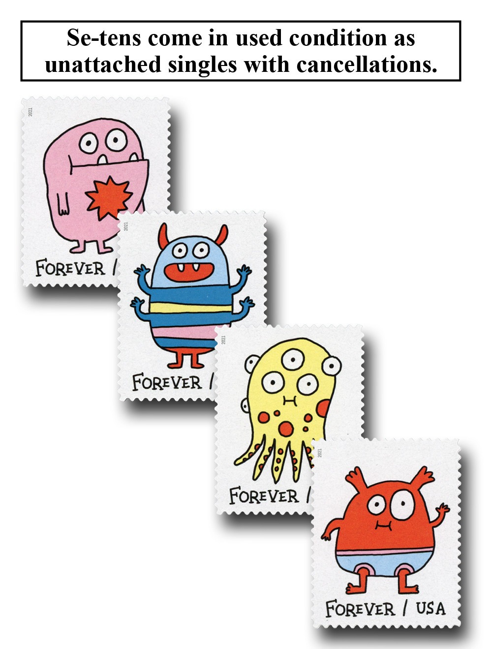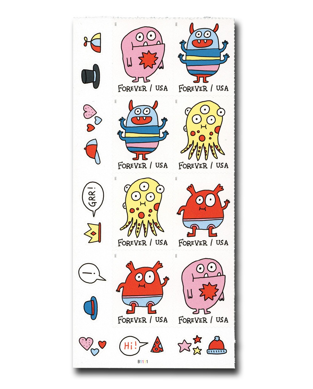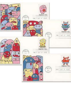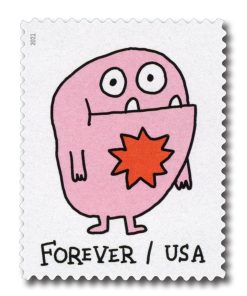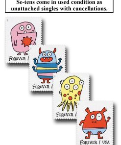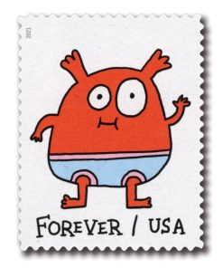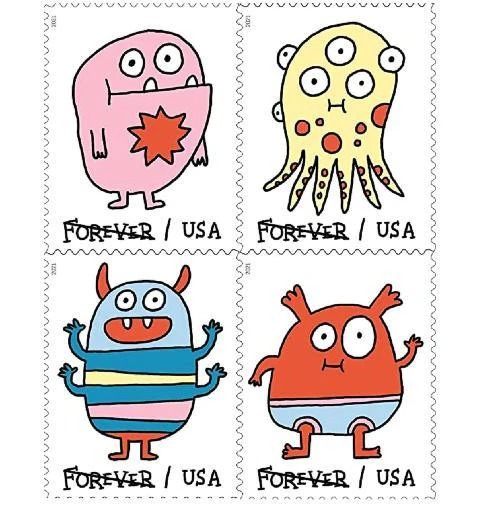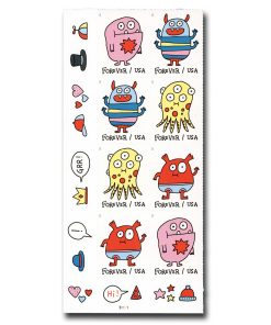 USPS Message Monsters First-Class Mail Forever Postage Stamps – 1 Sheet of 20 – The U.S. Postal Service will celebrate Message Monsters with the most playful, customizable Forever stamp design ever. The four monster illustrations on this pane of 20 stamps invite interactivity with dozens of self-adhesive accessories on the selvage. The monster-ific accoutrements include cartoony voice balloons and thought bubbles with exclamations and salutations, hats and crowns, hearts, stars, crazy daisies and other fun flair.
